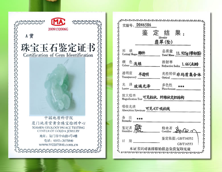 自2007年始,國(guó)家監(jiān)督總局下設(shè)的鑒定機(jī)構(gòu),在天然翡翠鑒定證書上標(biāo)注A貨字樣! 【證書級(jí)別】福建省廈門市珠寶檢測(cè)中心,通過(guò) CMA、CAL 國(guó)際國(guó)家認(rèn)證。 【查詢網(wǎng)址】www.5922075840.com.cn 或在搜索引擎中輸入“廣東省珠寶檢測(cè)中心”登陸查詢。 【關(guān)于復(fù)檢】收貨后如有疑問(wèn),請(qǐng)先到當(dāng)?shù)谻MA、CAL國(guó)家質(zhì)檢機(jī)構(gòu)復(fù)檢出證后,再與我們聯(lián)系!(復(fù)檢費(fèi)自理) 中國(guó)《國(guó)家產(chǎn)品質(zhì)量電子監(jiān)管網(wǎng)》查詢 → 證書真?zhèn)?br /> 中國(guó)《國(guó)家產(chǎn)品質(zhì)量電子監(jiān)管網(wǎng)》為入網(wǎng)產(chǎn)品賦予電子身份證,提供全方位的查詢服務(wù)。 【監(jiān)管網(wǎng)址】www.95001111.com 或搜索引擎輸入“中國(guó)產(chǎn)品質(zhì)量電子監(jiān)管網(wǎng)”查詢。 |