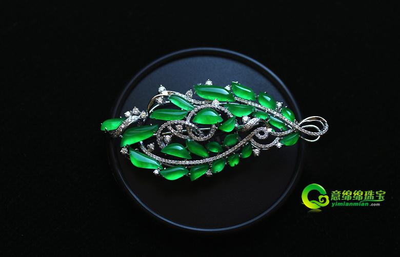 老坑玻璃種天然滿綠翡翠A18K白金鉆石玉胸針-吊墜