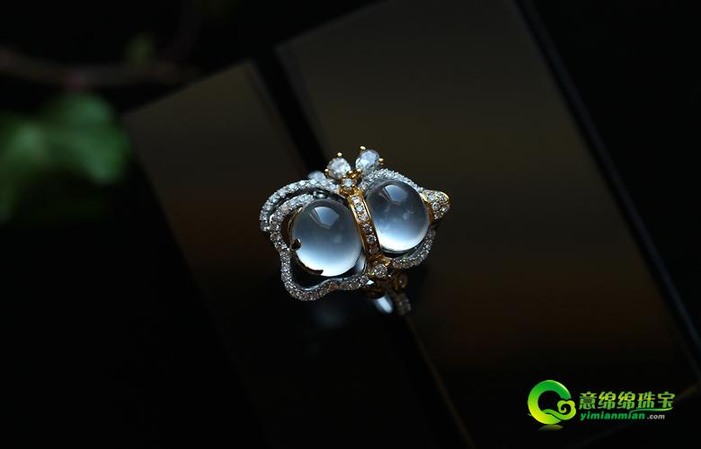 老坑玻璃種熒光翡翠A貨玉蛋面鑲金鉆戒指